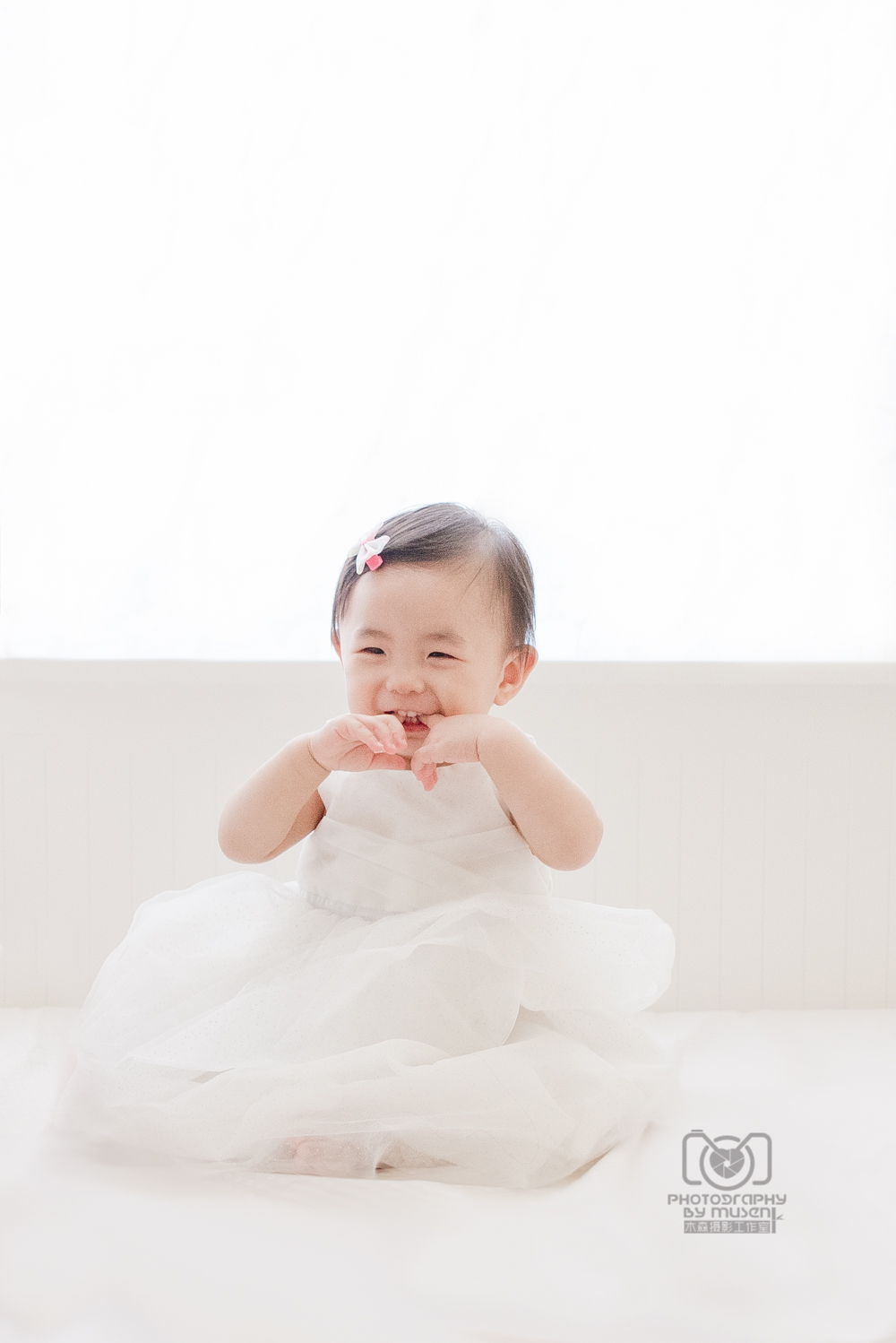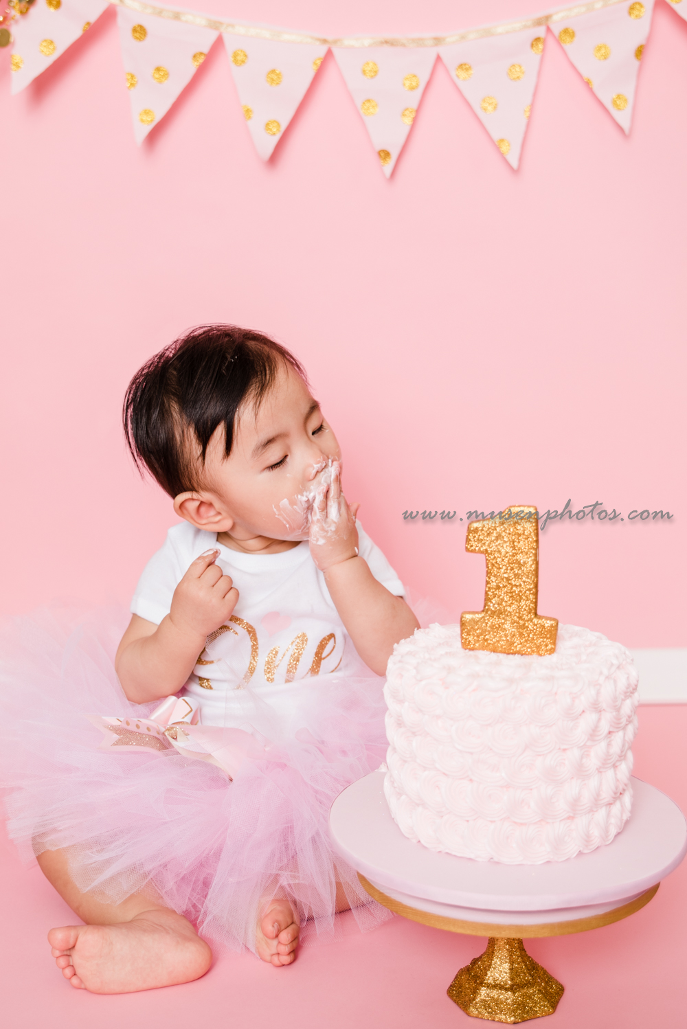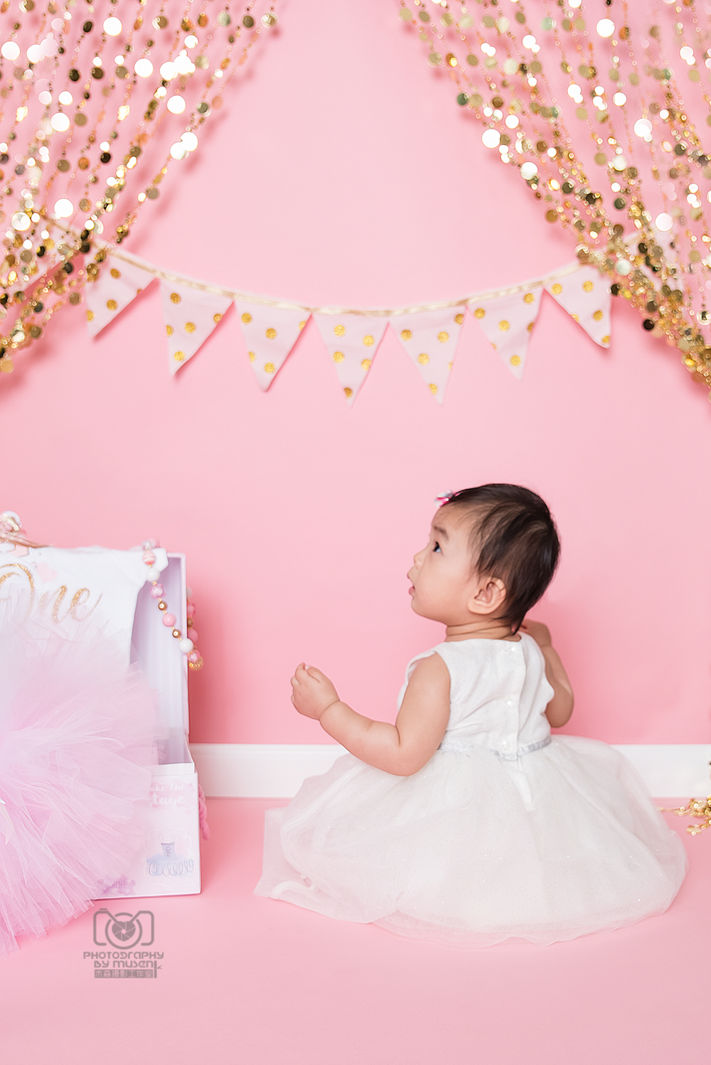 Bowie’s Mommy Googled “baby girl cash smash photo” to get an idea of what other babies’ cake smash photos are. There are hundreds or thousands picture there with different color themes and all look pretty. She finally chose Pink and Gold as Bowie’s theme colors. She believed Bowie would look very pretty in it. In addition, pink is her own favor color since she was a child. “I wished I had everything in pink in my room such as bedding, wall color, furniture, etc. Obviously, I did not get what I wanted, so I pass my wishes to Bowie. Not sure she would like pink as much as I do. Daddy has been complaining about too much pink in Bowie LOL.”, said Bowie’s Mommy.